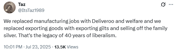 These are conversations our nation should have been having since 1997 but the public were persuaded to avoid even mentioning the issue under threat of being deemed “racist” or, whisper it quietly, “far right”. Instead we acquiesced into becomming what Starmer identified as an “island of strangers”. Indeed, when even the most managerial-class milquetoast PM has had to admit this, it seems these conversations can no longer be repressed. Liberalism is dead and there are no GDP figures that will convince the apostates back to the fold.